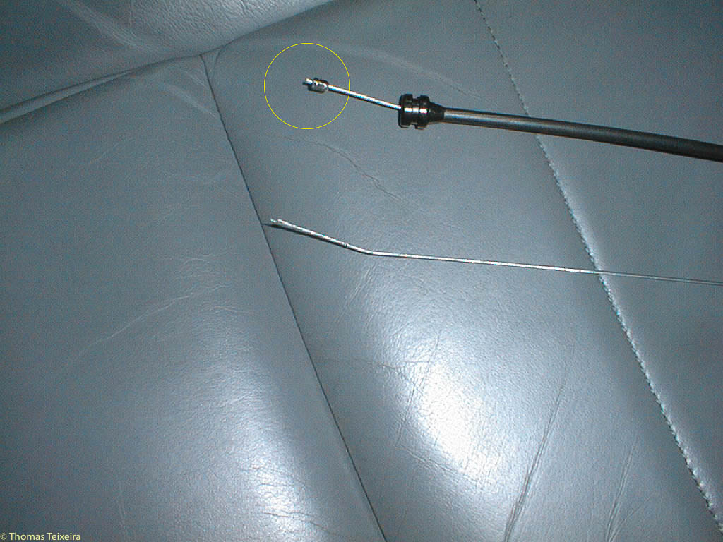 To start with, here's a picture of the broken release cable below the new cable that's replacing it. You can see the end of the new cable has something crimped on the end (inside the yellow circle) to engage the release lever.