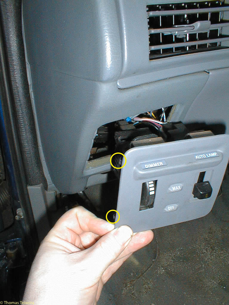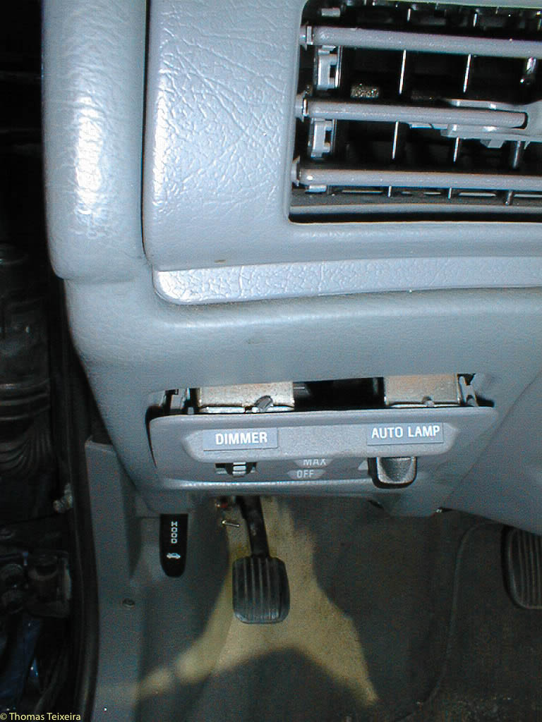 Before you can remove the old cable housing, you have to remove a clip that's holding it in place. On a SHO, this is pretty easy once you remove the panel for the dash board light dimmer and autolamp control. This panel is shown