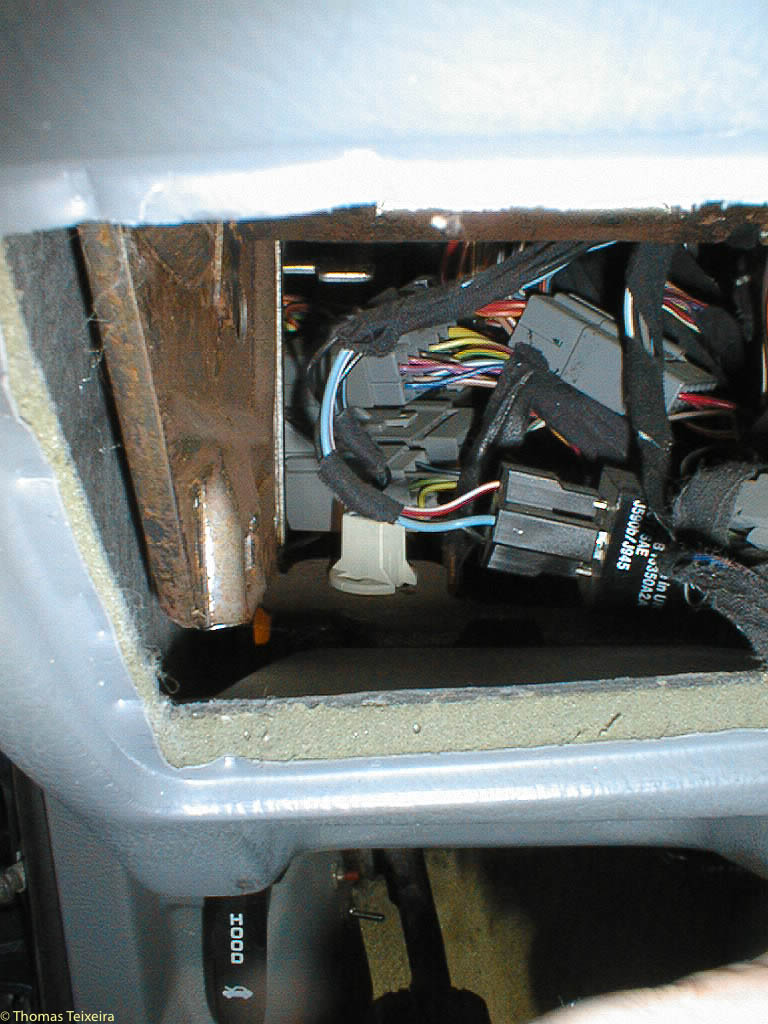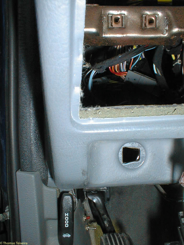 Notice the hole in the dash for the cable housing has an asymmetrical shape so the cable will only go in one way and you don't have to worry about having a "ESAELER EKARB" or something. First feed the cable assembly through the dash. Then